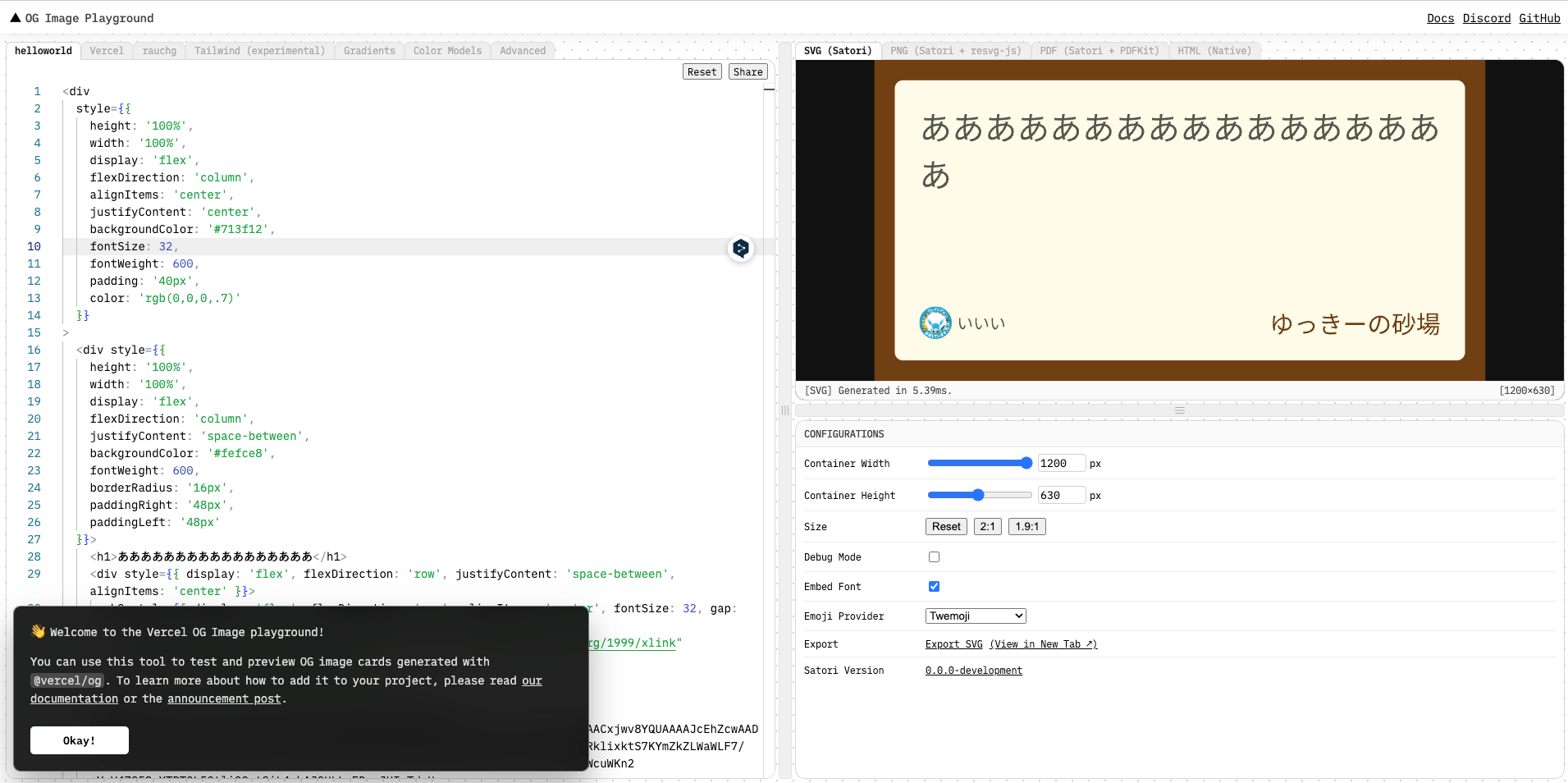 vercel/satoriとsharpを用いたSSGで生成しています!(本当はCloudflare Workerを用いてSSRで生成したかったけど、できませんでした。。。) vercel/satoriはReactコンポーネントからsvg画像を生成できるライブラリ、sharpは画像の変換など画像に関するいろいろなことができるライブラリです。